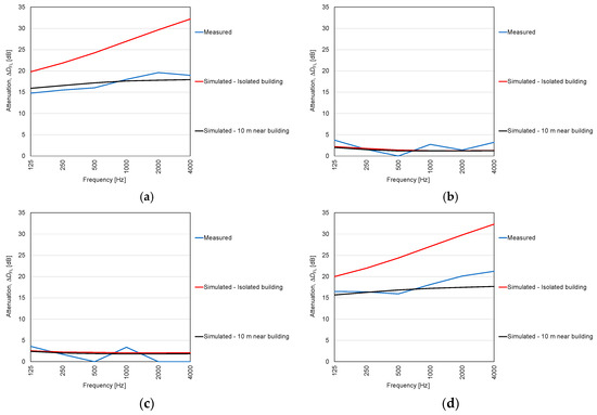 The minimum attenuations for positions A–B–C–D for floors F0, F1, F2 and F3 are 20.4 dB, 18.0 dB, 13.2 dB and 12.7 dB, respectively. In the case of a building placed 10 m from the façade, the minimum attenuations become 15.7 dB, 12.4 dB, 12.5 dB and 11.5 dB, respectively. The biggest differences can be observed for the ground and the first floors.