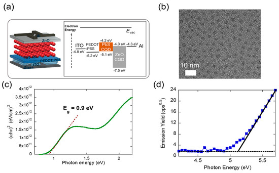 The size of the synthesized PbS CQDs was estimated to be ~3 nm from the transmission electron microscopy (TEM) image, as seen in Figure 1b. An energy band gap of 0.9 eV and a highest occupied molecular orbital (HOMO) energy level of 5.1 eV were determined from the optical absorption and PESA characterizations, respectively, as seen in Figure 1c,d, which is consistent with the size determined from the TEM image. During PESA measurements to measure the HOMO level of the PbS CQDs, the photocurrent was recorded in the photon energy ranging between 4.2 and 6.2 eV. We plotted the emission yield as a function of the incident photon energy to estimate the HOMO level, which is determined from the incident photon energy at which the effective emission is negligible. To prevent charging, we deposited PbS CQDs films on ITO-coated glass substrates.