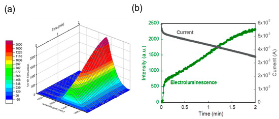 (a) Plots of electroluminescence (EL) spectra as a function of time during light emission under application of 1.5 V to the indium tin oxide (ITO) side. (b) Plots of current and EL intensity as a function of time.