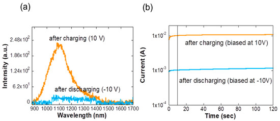 In our previous studies, we investigated interfacial charging of PbS CQDs, finding that the time scale of carrier trapping associated with surface traps corresponds to tens of seconds which is consistent with that of the current and EL intensity change in Figure 2b [31,32]. The long time scale over tens of seconds and the significant current change over an order of magnitude in Figure 3a in combination with the charging/discharging experiments in Figure 3b allow us to infer that the increase in the EL intensity during light emission is ascribed to the interfacial trapping of carriers at the PbS/ZnO interface.