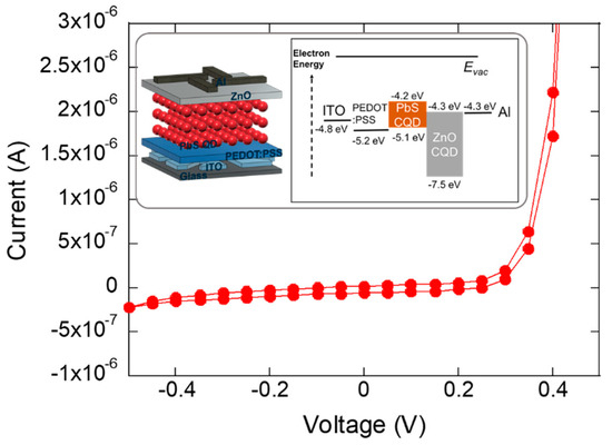 A significant difference in the current over an order of magnitude was observed depending on the polarity of the electrical pre-biasing (10 V and −10 V for 2 min), as seen in Figure 3b. This suggests that the charge injection energy level between the transport (PEDOT:PSS or ZnO) and the emission (PbS) layer was altered, depending on the polarity of the electrical pre-biasing. Indeed, a subtle change at the interfacial energy level by electrical bias stress causes an exponential difference in the magnitude of the current, assuming the electric-field enhanced thermionic emission model [29,30]. An interfacial energy level-dependent diode current was confirmed in the I-V curve of the ITO/PEDOT:PSS/PbS/ZnO/Al CQD LED below the turn-on voltage in Figure 4 in which the forward and reverse bias current was clearly observed. The formation of the forward and reverse bias regions suggests that the test structure we used consists of energetically well-defined interfaces for asymmetric carrier transfer. In the test structure with distinct electron and hole energy barriers, under the application of a positive or negative voltage to the ITO side, for example, carriers are selectively accumulated and depleted at the PEDOT:PSS/PbS and/or PbS/ZnO interfaces, modifying the interfacial energy level.