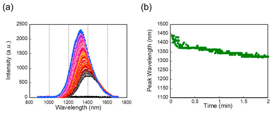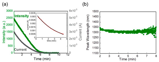 (a) Plots of EL intensity as a function of time wavelength for a PbS NIR QLED. (An applied voltage was 1.5 V during light emission.) (b) A plot of peak wavelength as a function of time.