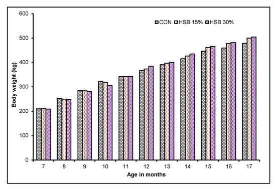 Despite increasing livestock production, feed management practice is considered an important factor in animal agriculture. Cortisol is an important indicator that is used to determine the stress condition of an animal. Increased levels of cortisol in the blood indicate that an animal may be under stress, which leads to a decrease in reproduction. Therefore, cortisol levels are measured to evaluate whether an animal is experiencing stress conditions. In this study, we determined, every month for the entire study period, the blood cortisol level of heifers fed the 10% and 30% HSB diets and the CON diet. Our results showed that the 10% and 30% HSB diet did not negatively affect the cortisol levels when compared with the CON diet. Feed additives can indirectly alter the cortisol level in blood serum, but some studies only show that feeding may change the cortisol level in blood serum. Progesterone and estrogen are considered reproductive markers. Butler and Smith [24] demonstrated a strong relationship between negative energy balance and conception rate. In this study, we evaluated the level of reproductive hormones in blood, and these hormone levels were not significantly different between heifers fed the 10% and 30% HSB diets and the CON diet, which reflected the reproductive performance of the heifers. From these study findings, we confirmed an improved energy balance when heifers were fed the 10% and 30% HSB diet. These hormones increase cholesterol, lipoprotein, HDL, and sodium excretion. Further, these hormones are closely associated with the measurement of DM intake, average daily gain, and feed efficiency in heifers.