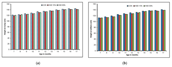Effect of feeding hydroponically sprouted barley on height at withers (a) and height at rump (b) of Holstein heifers.