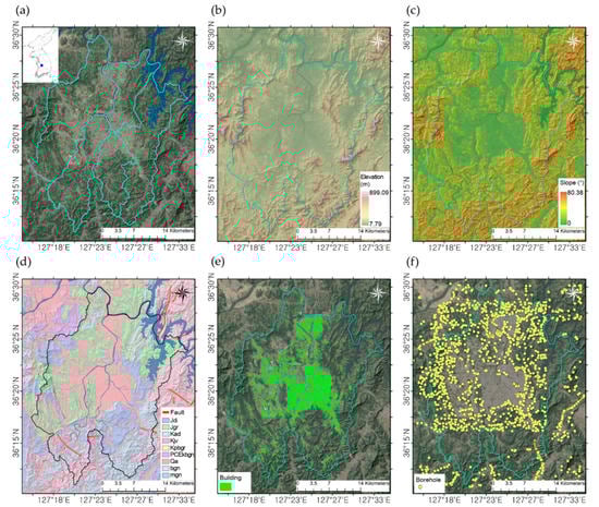 Testbed and geospatial database for Daejeon city: (a) administrative area map; (b) digital elevation model (5 m × 5 m) (http://map.ngii.go.kr/) [26]; (c) DEM-based slope map (5 m × 5 m); (d) geological map (1:50,000 scale) (https://mgeo.kigam.re.kr/) [27]; (e) buildings; (f) borehole dataset (https://www.geoinfo.or.kr/) [28]. The abbreviation in geological map: Jdi (Ironside Mountain batholith); Jgr (Jurassic granite); Kad (acidic dyke); Kjv (biotite-hornblende tonalite); Kpbgr (porphyritic biotite granite); PCEkbgn (Precambrian limeston); Qa (Quaternary alluvium); bgn (banded gneiss); mgn (mafic gneiss). The database is overlaid on google map (https://www.google.com/maps).
