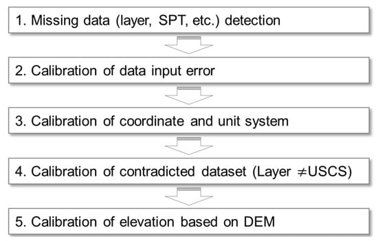 In geotechnical engineering practice, various borehole layout schemes are used to design a one-dimensional geo-layer profile and its characteristic coefficient. Since borehole log information is interspersed in time and place, there are inherent instabilities in the integrity of geotechnical DBs. These arise from differences in the purposes of the projects, ideas and techniques of the investigators and analyzers, and equipment performance. When experiments are translated into soil design properties with empirical or theoretical models, transformation uncertainty is added. Such uncertainties make geotechnical designs less reliable [33]. In measurements with appropriate statistical methods applied, it is important to minimize or eliminate “errors”. Thus, for reliable post-processing, the blended definition of the attribute or biased value from a borehole log should be checked for abnormalities in the geotechnical DB. Accordingly, quality assurance procedures were established first (Figure 3) to verify and exclude errors based on the standardized schemes used to develop the geotechnical DB.