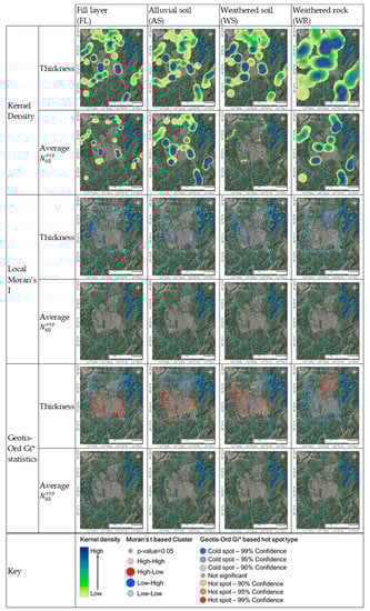 Comparison of three hot spot analysis algorithms (Kernel Density, Local Moran’s I, and Getis-Ord Gi* statistics) applied to the engineering geo-layer thickness and average for fill layer; alluvial soil; weathered soil; weathered rock.