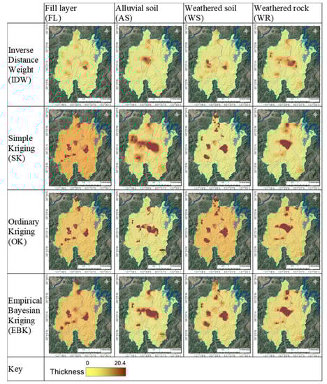 Comparison of geospatial maps of engineering geo-layer thickness between different geostatistical interpolation algorithms including: Inverse Distance Weighting; Simple Kriging; Ordinary Kriging; Empirical Bayesian Kriging.