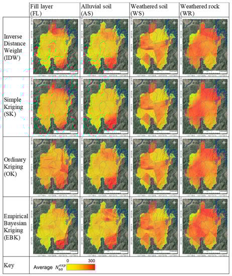 To predict reliable zonal geotechnical characteristics for the study area, the best-fitting geospatial interpolation model with the lowest prediction residuals was selected. Kim et al. [3,55] suggested an optimization procedure for geostatistical analysis of soil properties. A step-by-step adaptive optimization technique that used a GIS platform and geostatistical methods [56]. Cross-validation verification tests were applied using the four interpolation methods IDW, SK, OK, and EBK. The grid-based interpolation and zonation with DEM was assessed to build the reliable surficial geometry assigned with engineering geo-layer thickness and average (Figure 6 and Figure 7).