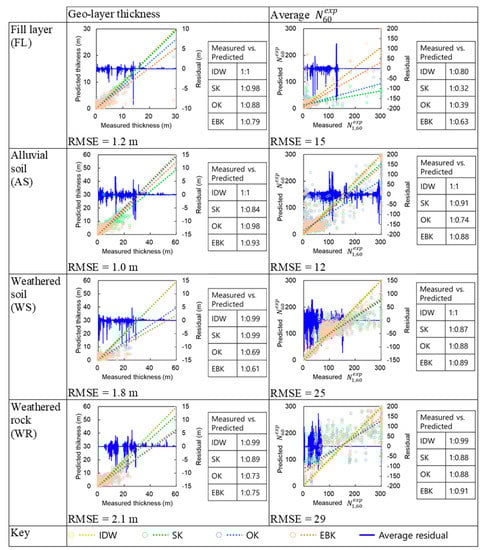 Root mean square errors (RMSEs) based on cross-validation were calculated for the best-fitting model. The sequential value at each sampling point was calculated by computing an experimental variogram and a kriging model, after exclusion of the measured target values at a given point. Differences between the predicted and measured values (geo-layer thickness and average ) were compared, and prediction residuals were computed for each borehole dataset (Figure 8). Geo-layers with shallower depths (i.e., closer to the surface) and lower showed greater fluctuations in the prediction residuals. This is because values in shallower geo-layers with low soil stiffness are concentrated. For the interpolations of thickness, the average residuals ranged between −5 and −5. On the contrary, the average residuals of average ranged between −100 and −100.