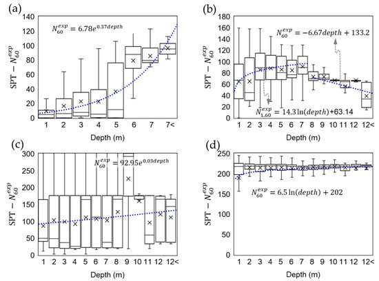 Box plots of correlations between grid-based predicted geo-layer depth and average : (a) fill layer; (b) alluvial soil; (c) weathered soil; (d) weathered rock. The blue dotted lines show the regression line and equations with the highest R2.