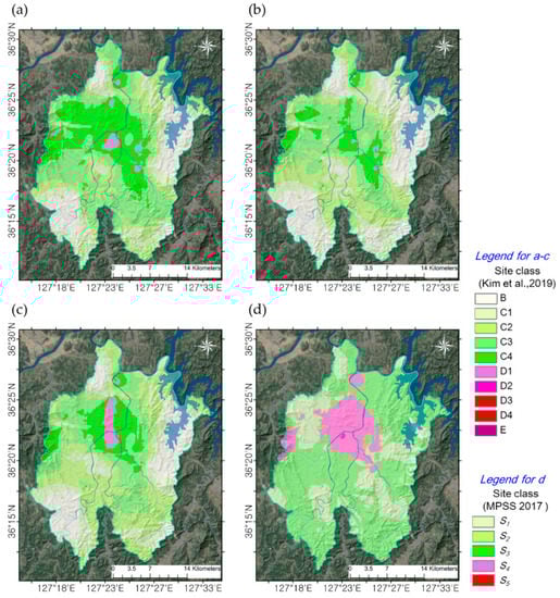 The domestic seismic site classification system [64] was also applied using a combination of H and VS,Soil. Then, a proxy-based empirical site classification system, which was statistically normalized correlations between site response parameters and remote sensing datasets, was proposed to evaluate the local and regional seismic site effects considering the geotechnical and geographical influences [19]. Since there are inadequate borehole datasets for site classification in most or urban area, proxy-based seismic zonation is so effective. In Daejeon city, the local correlations with DEM-based and geological condition were not approved in seismic code in South Korea. Thus, site classification was applied based on the only geotechnical criteria.