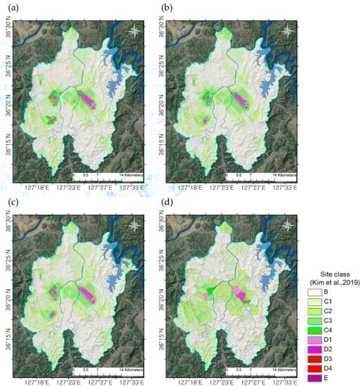Based on the spatial distribution of site response parameters, site classification criteria C (C1 to C4) and D (D1 to D4), which correspond to vulnerable site conditions, were distributed in the plains near rivers where residential or commercial facilities are concentrated or where industrial facilities are located. In some regions, if the classification according to VS30 is applied, the site classification ranges up to class E. In mountain areas and farmland, most sites classified using the revised seismic design criteria [64] were class S2 or S3, excluding urban areas that were classified as S4 or S5. Seismic zoning plans using the site classification based on VS,Soil for domestic applications, or VS30 for global standards, are more appropriate with other site parameters to support conservative seismic decision-making processes in a metropolitan area, given that deeper soft ground can better be classified in the same grid unit. In addition, considering that a target area may not only be a residential area, but also an industrial and commercial center, it may be necessary to undertake seismic performance evaluations for large facilities.