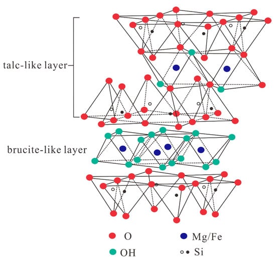 The crystal structure of the chlorite has a 2:1 ratio of tetrahedral (T) to octahedral (O) layers (talc-like) with edge-sharing M2+(OH)6 octahedra (brucite-like layer) in the interlayer between each set of 2:1 sheets [] (Figure 1). Chlorite has three octahedral cation sites in octahedral layers, one slightly larger M1 site and two slightly smaller M2 sites []. Cation substitution of chlorite is common in M sites, and mineral chemistry can vary significantly from endmember composition. The substitution of Si by Al occurs in the tetrahedral sheet of 2:1 layer, whereas the mutual substitution of Mg and Fe usually occurs in the brucite-like layer and the 2:1 layer of octahedral sheet [].