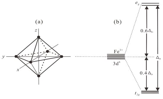 (a) Six-coordinated octahedron around Fe and (b) crystal field splitting of Fe2+ 3d orbitals in the regular octahedron. The octahedral distortion will cause further splitting.
