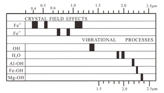 In the spectral range of 350~2500 nm, the spectral absorption features of minerals are the diagnostic of crystal structure and chemical composition. The spectra of different minerals are generally different, even the minerals of the same family also have subtle spectral differences due to chemical composition variations. There are two general processes that cause spectral absorption features of minerals: electronic and vibrational [,,,,]. In the visible and near-infrared spectral range (VNIR: 350~1200 nm), the causes of spectral absorption features are electronic processes, including crystal field effects, charge transfer absorptions, conduction bands, and color centers, among which the crystal field effects of Fe2+ and Fe3+ and the charge transfer absorptions of Fe2+-Fe3+ are most common. In the short-wave infrared spectroscopy (SWIR: 1200~2500 nm), the causes of the spectral absorption features are predominated by the vibration process, which is mainly caused by the first overtone of the hydroxyl group (OH) and the combination vibrations involving OH stretching and cation-O-H bending in the octahedron. Common vibrational absorptions include aluminum hydroxyl (Al-OH), magnesium hydroxyl (Mg-OH), water (H2O), and carbonate (CO32−), etc.