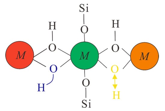 Schematic diagram of OH vibrations in octahedral sheet of chlorite. The OH-bending motion is shown in blue and the OH-stretching motion in yellow (modified from Bishop []).