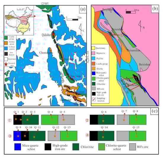 (a) Simplified regional geological map of Anshan area, (b) geological map of Qidashan Iron Deposit, and (c) sketch diagram of sampling.