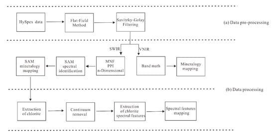 The HySpex data processing mainly includes two parts: mineralogy mapping and chlorite spectral absorption features extraction (Figure 6b).
