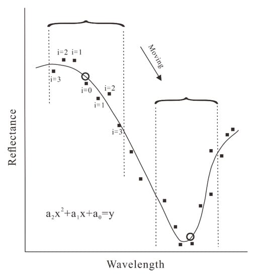 The reflectance data should be filtered to improve the S/N. The Savitzky–Golay filtering (SG) is a widely used technique in modern hyperspectral remote sensing studies [,,]. The principle of SG is the least square filtering based on moving window []. The moving window contains the point to be smoothed in the center of the window with multiple adjacent points on either side of the center point. All the points in the window are used to perform the least squares fitting, but only the central point (i = 0) is smoothed (Figure 8). It works especially well when the typical band of the signal is narrow, and the height and width of the spectrum can well be preserved. The filtering effect of the spectrum varies with the size of the moving window and the order of the polynomial. A larger window can produce better smoothing effect, but may lose the tiny absorption features (Figure 9b). A higher order polynomial can achieve a better smoothing without attenuation of data features [,]. In this paper, the moving window size of 5 points and 2 polynomial order is adopted for the hyperspectral images (Figure 9a).