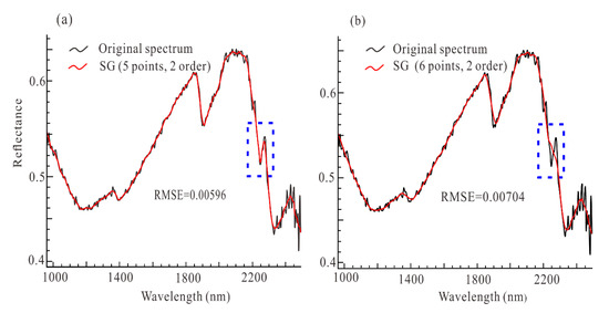 The results of Savitzky–Golay filtering: (a) smooth result of 5 points and 2 order and (b) smooth result of 6 points and 2 order. A larger window will minimize the subtle spectral features (blue box).