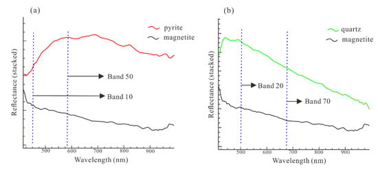 High-grade iron ore is mainly composed of magnetite and pyrite whose spectral absorption features are concentrated in VNIR. Band math is a common remote sensing method to distinguish the opaque metal minerals []. High-grade iron ore is mainly composed of magnetite and pyrite. According to the spectra of pyrite and magnetite in VNIR image (Figure 10a), the model is expressed as K1 (Band 10–Band 50). The K1 is the slope of the spectral reflectance from Band 10 to Band 50. Obviously, K1 of pyrite is greater than 0, whereas less than 0 for magnetite. BIFs ore is mainly composed of magnetite and quartz, and the slope of the spectral reflectance from Band 20 to Band 70 are quite different (Figure 10b). The model distinguishing magnetite and quartz is then expressed as K2 (Band 20–Band 70) < −0.5 for quartz and −0.5 < K2 < 0 (Band 20–Band 70) for magnetite.
