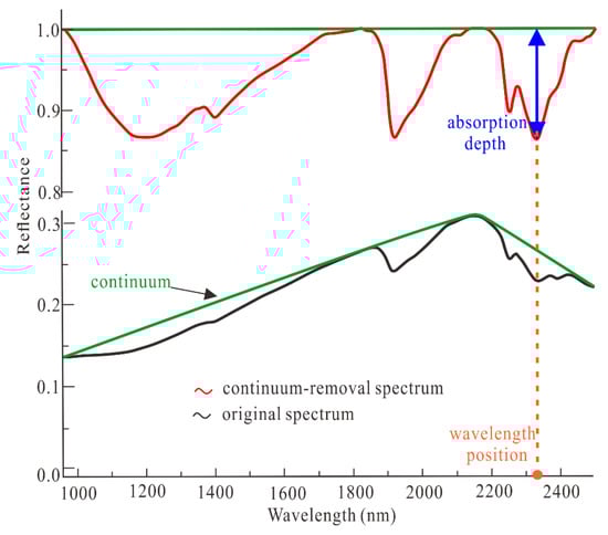 The result map of mineral classification was converted to vector, then the chlorite was extracted and other minerals were masked to obtain the pure chlorite thematic map. The continuum-removal was used to extract the absorption wavelength position and depth of chlorite. The continuum is a “shell” wrapped around the spectrum (Figure 11). The continuum-removal can remove the “background spectrum” to highlight the subtle absorption features, which is beneficial to the extraction and comparison of the spectral features of different minerals.