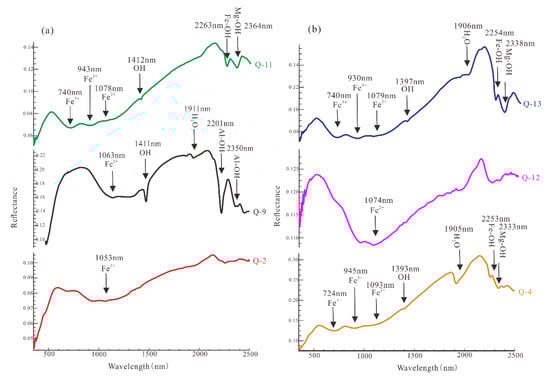 Chlorite is marked by diagnostic absorptions around 2250 and 2350 nm [,,,]. By mutual verification with hyperspectral imaging, the samples containing chlorite from wall rock of BIFs (Q-4, Q-8, Q-13, and Q-15) and high-grade iron ore (Q-3, Q-6, Q-11, and Q-14) were selected, and the wavelength positions around 2250 and 2350 nm were extracted (Figure 13).
