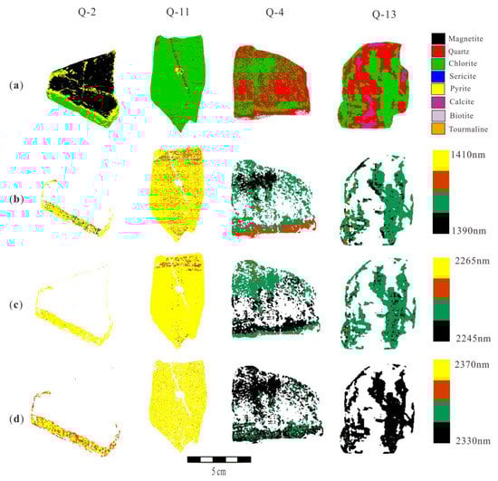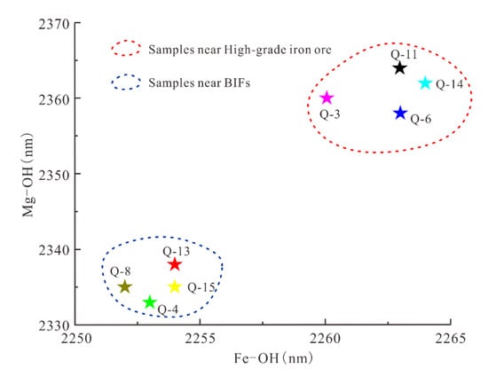 According to the HySpex data processing model, the wavelength position of OH, Fe-OH, and Mg-OH absorptions of chlorite were mapped. Figure 17 illustrates that there are obviously two kinds of chlorite, which have different absorption wavelengths of OH, Fe-OH, and Mg-OH. The absorption wavelengths of OH, Fe-OH, and Mg-OH related to high-grade ore (Q-2 and Q-11) are mostly between 1400 and 1410, 2260 and 2265, and 2360 and 2370, nm, respectively, whereas those related to BIFs (Q-4 and Q-13) are between 1390 and 1400, 2245 and 2255, and 2330 and 2350 nm. This result is consistent with the result of ASD spectrometer.