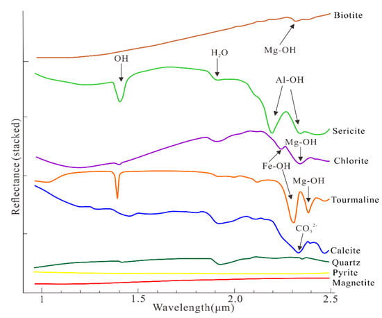 According to the HySpex data processing model, the endmember spectral library is shown in Figure 14. The chlorite, sericite, calcite, biotite, tourmaline, quartz, magnetite, and pyrite were extracted from the HySpex images.