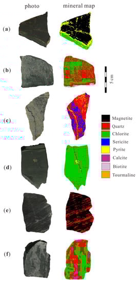 The result of hyperspectral mineral mapping: (a) the photo and mineral map of Q-2; (b) the photo and mineral map of Q-4; (c) the photo and mineral map of Q-9; (d) the photo and mineral map of Q-11; (e) the photo and mineral map of Q-12; (f) the photo and mineral map of Q-13.
