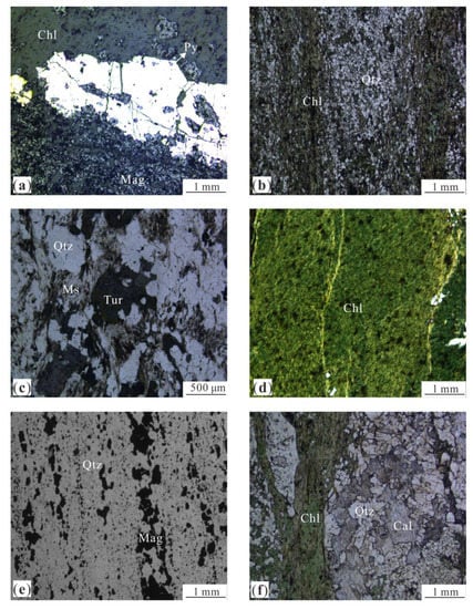 The Qidashan Iron Deposit is a typical BIFs deposit. The BIFs are chemical sedimentary rock characterized by the commonly alternating presence of iron-rich layers and silica-rich layers []. BIFs-related iron deposits in China are mainly composed of magnetite (average 30.35% total Fe) with subordinate amount of high-grade magnetite ores (total Fe ≥ 50%) []. Low-grade iron ores (BIFs) in the Qidashan Iron Deposit are composed of quartz band and magnetite band with a width of about 1 mm. The high-grade iron ores in the BIFs are mainly massive and composed of magnetite, quartz, and chlorite. They are considered to have resulted from hydrothermal enrichment of BIFs near the faults, which are consistent with the occurrence of the BIFs layer []. The main types of wall rock alteration of Qidashan Iron Deposit include chloritization, sericitization, biotitization, and pyritization.