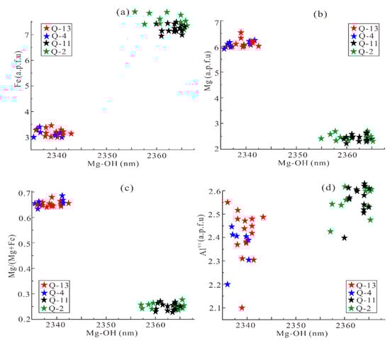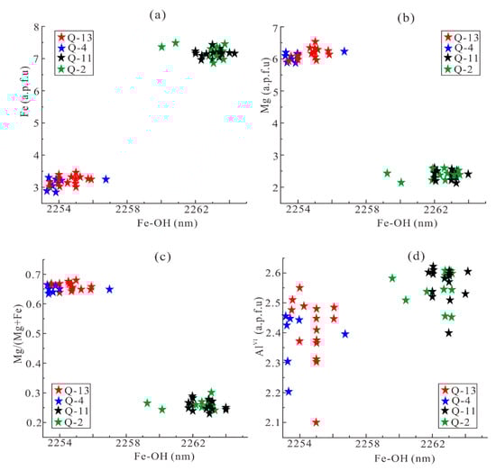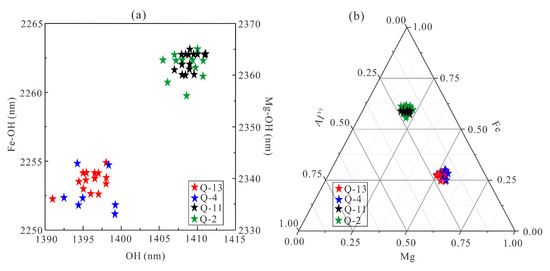 Figure 18 illustrates that there are obviously two types of chlorites (Figure 18a): the wavelengths of OH, Fe-OH, and Mg-OH of chlorite related to high-grade iron ore (Q-2 and Q-11) are located at 1405~1410, 2260~2265, and 2360~2370 nm, respectively, whereas the corresponding wavelengths related to BIFs (Q-4 and Q-13) are all shorter. On the other hand, similar conclusions can be drawn from the molecular formula of the chlorite: the Fe content in Q-2 and Q-11 is higher than that in Q-4 and Q-13, whereas the Mg is just the opposite (Figure 18b). The AlVI in these two samples are approximately equal.