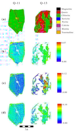 The absorption depth is also one of the spectral features. The absorption depths of OH, Fe-OH, and Mg-OH bands of chlorite in Q-11 and Q-13 are illustrated in Figure 19. In comparison with the wavelength, there is no obvious difference between the absorption depths of these samples.