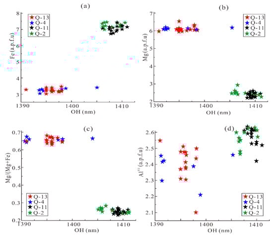 The relationship between the wavelength of OH band and the content of cations in the octahedral layer of chlorite: ((a) the relationship between OH and Fe; (b) the relationship between OH and Mg; (c) the relationship between OH and Mg/(Mg + Fe); (d) the relationship between OH and AlVI (the overlap points have been offset for clarity)).