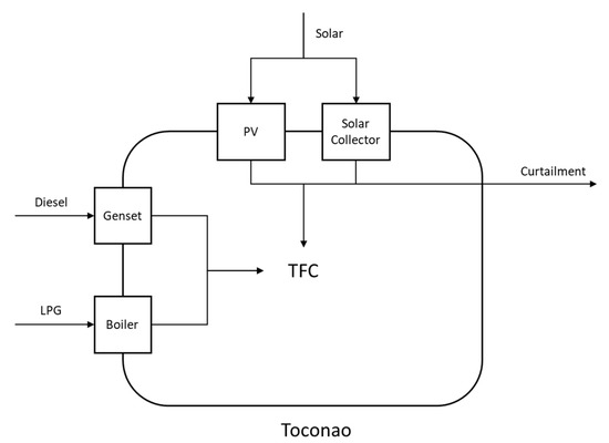 Figure 1 presents a conceptual scheme of the village and the energy carriers considered in this study. Toconao will be considered as an isolated country and the International Energy Agency’s (IEA’s) energy accounting method [39] will be adopted to estimate the Total Primary Energy Supply (TPES) entering the system.