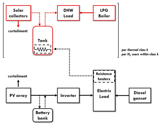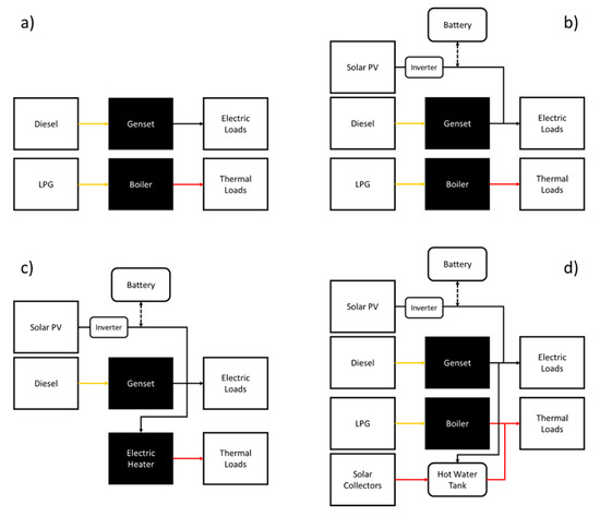 (b) Conventional micro-grid, in which a typical hybrid micro-grid (including photovoltaic (PV) panels, batteries, and diesel generators) is installed to only supply purely electric loads, while DHW loads are covered by LPG boilers. This configuration scenario is defined to represent the mainstream strategy adopted in the framework of off-grid projects, which rarely take into account non-electric loads.