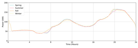 Figure 4 reports four different load profiles, one per each modeled season, of the electric daily load profile of the entire village, generated with a 1-min time-step. The profile shows a peak of about 175 kW in the evening (approximately around 8:00 p.m.).
