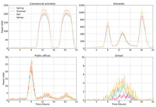Electric load profiles are generated based on four different sets of input data, reproducing four specific seasonal behaviors. The data were collected during a field campaign conducted by the authors in the study area (2017), in which specific questionnaires to investigate the ownership and usage patterns of electrical and thermal appliances were administered to the population. The seasonality of the loads refers to dawn and dusk times, which influence the working hours of street lighting, outdoor, and indoor lights. Also, the school follows seasonal behavior and the electric load is considered null during the holiday period (December–February). Moreover, the loads are modeled depending on the day of the week, and, for example, the school is not considered to have any load during the weekends.