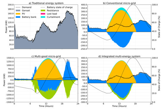 (c) Multi-good micro-grid, where the hybrid micro-grid is sized in order to meet all the energy needs of the village, hence including DHW loads, which are in this case supplied by means of electric heaters.