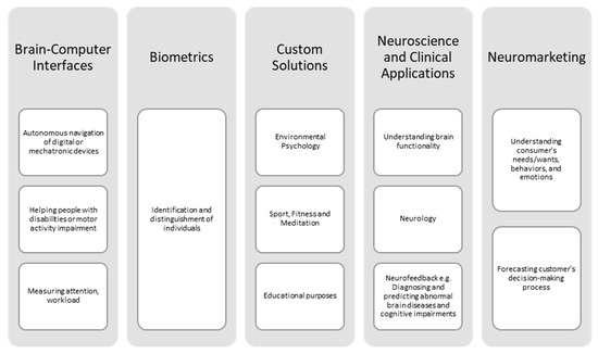 EEG devices can provide valuable information about human mental health states, thoughts, and imagination. Thus, researchers in different areas of research have utilized it. Figure 3 demonstrates five categories of EEG data applications and their relevant sub-categories. In a later section, EEG Headset Applications and Research Usages, a report of relative research use for various devices is provided as part of a table.