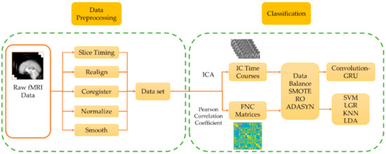The data processing framework of this study is divided into two parts: data preprocessing and classification. In the data preprocessing, the standard preprocessing process of functional magnetic resonance imaging (fMRI) is used. In data classification, independent component analysis (ICA) and Pearson correlation coefficients are performed on the processed data respectively to obtain independent component (IC) time courses and functional connectivity (FNC) matrix. After data balancing, the convolution-Gated Recurrent Unit (GRU) network and the traditional classifier are used for classification and the performance is compared.