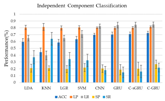 Figure 5 and Table 1 show the classification performance of seven classification methods using independent component time series as training data in this study. Classification using the convolution-GRU network resulted in a classification accuracy of 72.2 ± 2.9%, while using traditional classifiers (LDA, KNN, LGR, SVM) to classify time series of independent components yielded poor results. SVM gives the best performance in the traditional classifiers which achieved 63.2 ± 4.4%. It indicates that the convolution-GRU network used in this study has achieved a large improvement in classification accuracy. In terms of the precision and recall of the two classes, the convolution-GRU model has achieved the best classification effect of the majority class, and the precision of the minority class has also reached 26.7 ± 6%. While the precision of the majority class of the traditional classifier is comparable to that of the deep learning model, the recall of the majority class is lower, and the best performing SVM reaches only 70.9 ± 5.0%. This indicates that the convolution-GRU model has fully learned the features of the majority class. For minority class, traditional classifiers often have a higher recall rate, but the precision rate is the same or lower than some simple deep learning models, while the minority class precision rate of the convolution-GRU model reached 26.7 ± 6.1%, which shows that this model can reduce the probability that samples from majority class are misclassified, thereby improving the credibility of the classification results. For deep learning models, when CNN, GRU, or convolution-single GRU models are used for classification, the performance of the majority class is similar to the convolution-GRU model, but the performance of the minority class is poor.