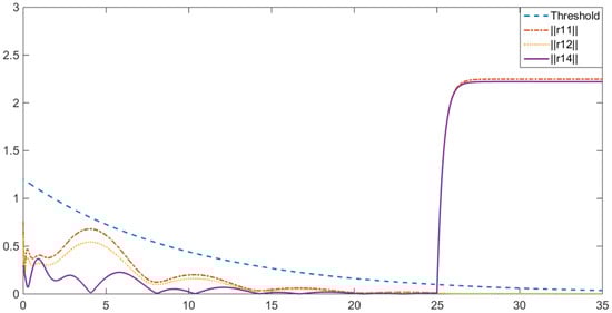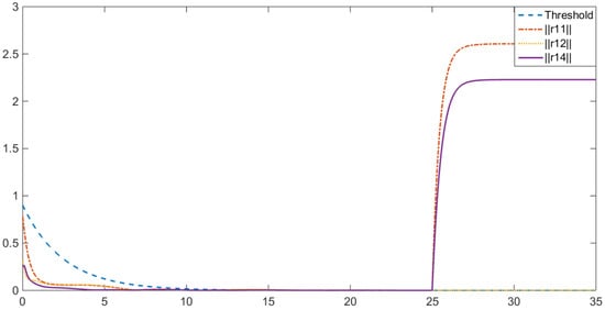 The fault is assumed to be a constant and occur in the first element of , i.e., , which occurs after 25 s. Residual generators , and in agent 1 are shown as Figure 2, which are represented by 2-norm type. According to Remark 8, we could choose a positive scalar , which is larger than , and , and , which is larger than , and , combined with . Then, the isolation threshold could be set as .