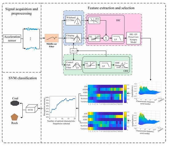 (1) We proposed an original feature extraction method that integrated the AN response model with auditory spectrum. In this system, the AN response model was applied to process the coal and gangue’s acoustic pressure signal to simulate the decision-making judgment of workers’ ears during the actual coal mining process. The auditory spectrum, constituted of each characteristic frequency of the AN response model, was used to extract features.