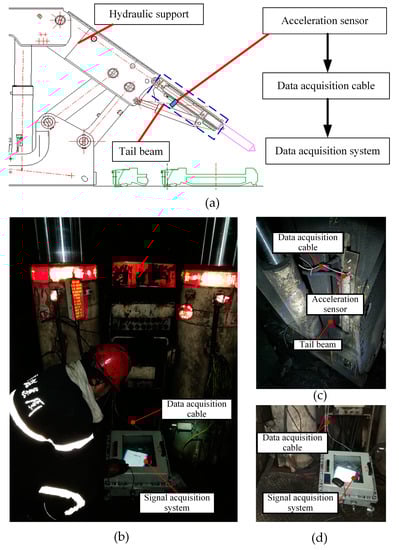 The coal-gangue vibration data acquisition experiment conducted in the Tashan Coal Mine. (a) Schematic view of the experiment; (b) Components of the experimental platform; (c,d) Signal acquisition process (signals are transmitted from the acceleration sensor to signal acquisition system via data acquisition cable).