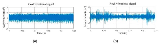 The experiment was conducted on the No. 8222 working platform in the Tashan Coal Mine, as shown in Figure 2. The data collection procedure was as follows: First, an integrated electronics piezoelectric (IEPE) acceleration sensor detected the vibrational signal of the tail beam; then, the vibrational signal transmitted by the data acquisition cable was collected by a signal acquisition system (DH5925N, Donghua Testing Technology Co., Shanghai, China). The signals were obtained with sampling frequency of 12.8 kHz. The collected signals were segmented into 0.25 s for analysis. Figure 3 shows part of the coal and gangue vibrational signals.
