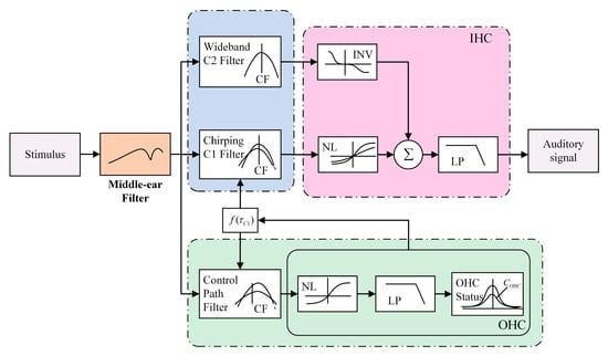 The feedforward control path is composed of broadband filter and outer hair cell section including low-pass filter, static nonlinearity, and scale zooming, which can adjust the gain and bandwidth of the C1 filter to reflect several level-dependent characteristics in the cochlea [,].