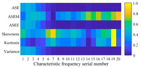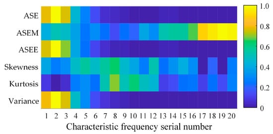 Step 1. Calculate the variance vector where v(i,f), (i = 1, 2, …, 6; f = 1, 2, …, 20), is the variance between the i-th feature’s values corresponding to signal of the f characteristic frequency and calculate a variance matrix as: