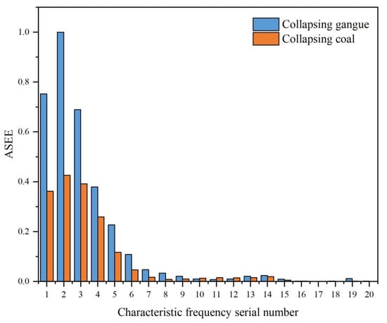 As mentioned above, in terms of a single feature, each type of coal-gangue feature is significantly distinct. Take ASEE as an example, the comparison of such features is shown in Figure 10. As shown in Figure 10, at a low frequency, ASEE of falling gangue samples is significantly greater than that of falling coal samples, which can represent more disorder of gangue energy distribution. Hence, the characteristics of coal-gangue feature are distinguishable and can be applied as the features of coal-gangue recognition.